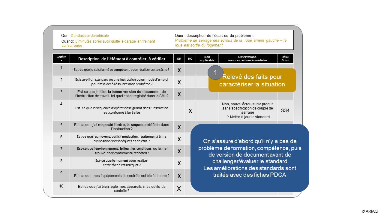Tout commence par organiser un relevé des faits (observations terrain, mesures, comparaison des pièces conformes et non conformes, recueil de documents, interview avec les personnes qui ont découvert et subi les conséquences du problème) et la formalisation claire du problème selon le format QQOQCPC.